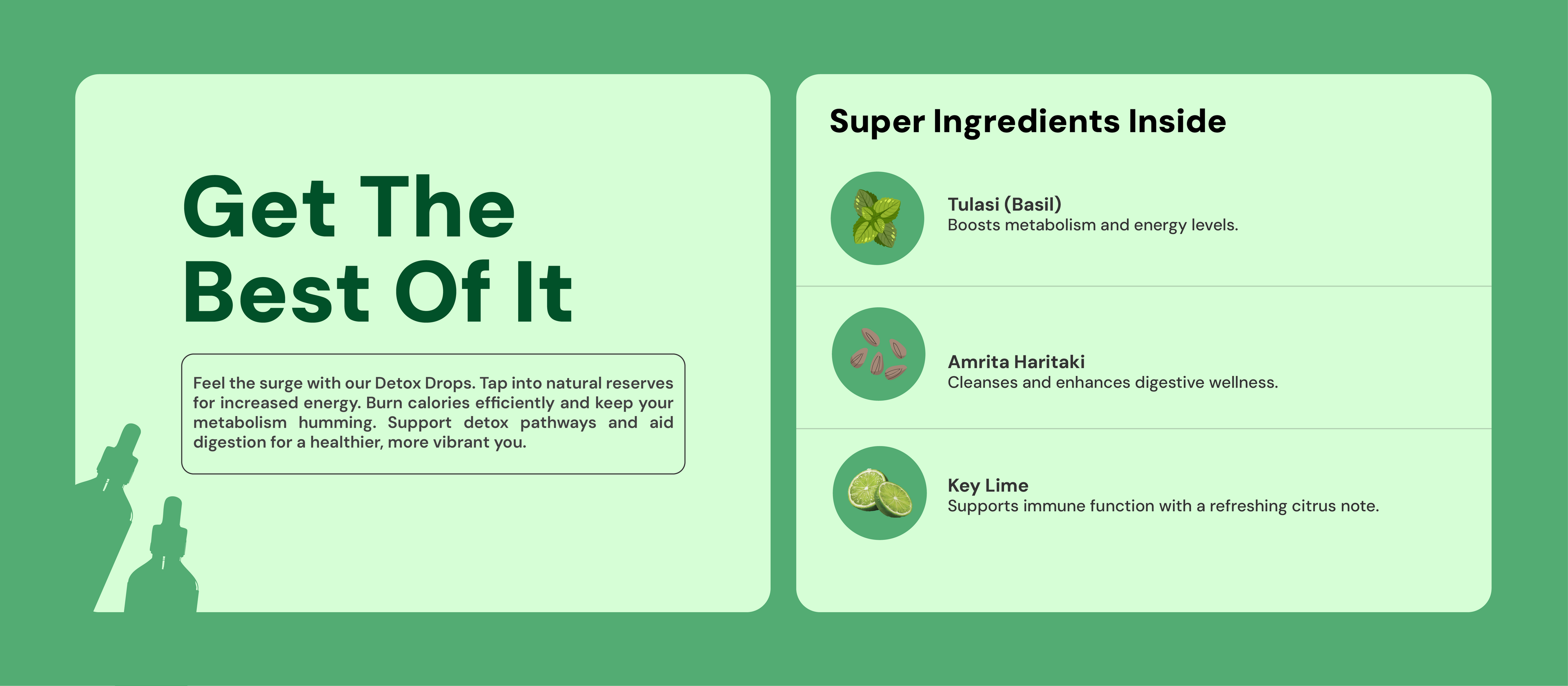Start your day on the right foot with our Detox Drops. This nature-infused blend kick starts your wellness journey. These scientifically curated drops enhance your body’s natural detox process with Terminelia Chebula, Ocimum Sanctum & Citrus Aurantifolia . Feel rejuvenated and fresh from the inside out. Embrace a fresh start with the power of Haritaki, Tulasi, and Lime. Enjoy a revitalized and cleaner you!