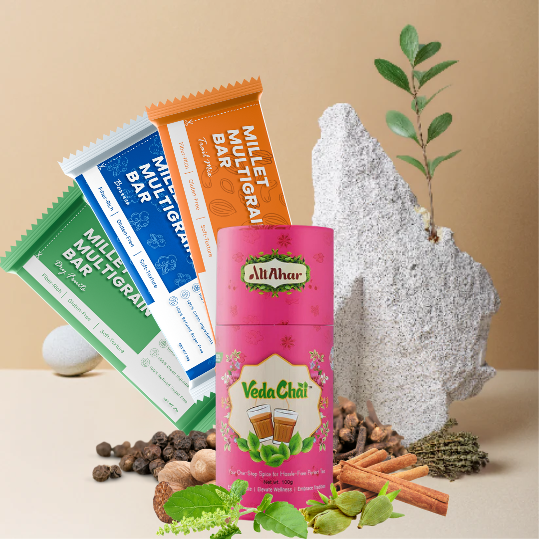 AltAhar Millet Bars Assorted Box and Immunity Veda Chai Masala Combo - The Millet Bars Assorted Box includes a delicious mix of Trail Mix, Berries, and Dry Fruits bars — each made with nutrient-rich millets, jaggery, dates, rolled oats, and nuts for a natural energy boost. Rich in fiber, plant protein, and essential minerals, these bars are perfect for guilt-free snacking, travel, or post-workout fuel.